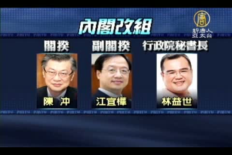 【新唐人亞太台2012年1月27日訊】來看到今天的政治新聞焦點。馬總統26日邀請行政院副院長陳冲到中興官邸密談後,確定由陳冲接任吳敦義,出任新閣揆,內政部長江宜樺將接任副閣揆,未能連任成功的立委林益世則任行政院秘書長,至於立法院副院長曾永權擔任總統府秘書長,等到31日吳內閣總辭後,第一波的內閣改組就完成。
