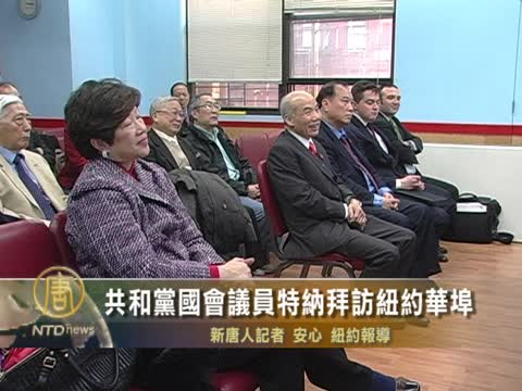 【新唐人2012年1月28日訊】代表紐約第9選區的聯邦眾議員、共和黨人鮑勃•特納(Bob Turner)1月27日拜訪了紐約華埠中華公所。他和同行的紐約州共和黨委員會主席和亞裔代表向華人介紹了共和黨人的參政理念,並鼓勵更多華人參政。請看報導。