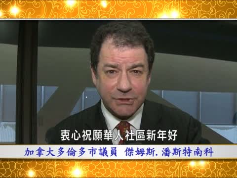 【新唐人2012年1月28日訊】我是多倫多第十選區的市議員傑姆斯.潘斯特南科,衷心祝願華人社區新年好!明年是龍年,這是非常的機會實現我們個人的目標和計劃,以及回報於這個城市,我祝願每一位華裔有一個健康和繁榮的新年。