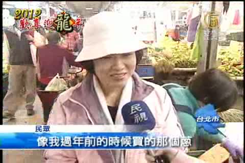 【新唐人亞太台2012年1月28日訊】新聞一開始,帶您來看到,今天是大年初六,傳統市場開市,不少民眾趕緊出來買新鮮蔬果,好在因為到貨量充足,菜價跟過年前比起來稍微便宜了一些,不過菜販也說,元宵節前蔬果的需求量大,加上天氣不穩定,價格可能還會往上飆。