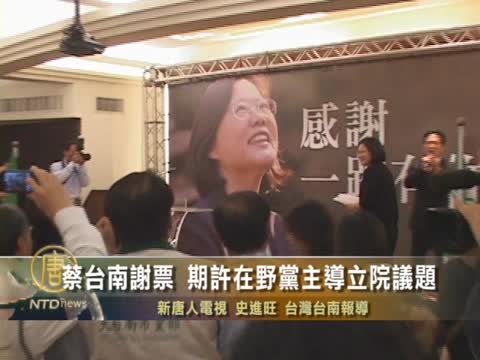 【新唐人2012年1月29日訊】民進黨主席蔡英文今天(28日)下午到臺南進行謝票之旅,許多支持者高呼加油,並期待「四年再戰」,蔡英文只是微笑以對,她期許民進黨未來能夠繼續在立院主導議題, 民進黨40位年輕立委,將是台灣人民寄託的對象,應挑起下個世代的責任。