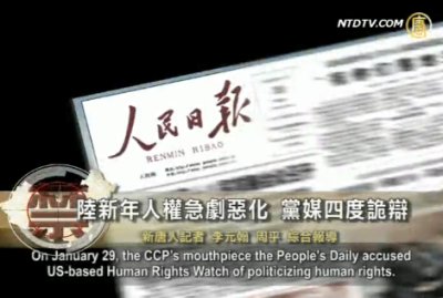 《人民日報》1月29號再度發表評論,指責美國「人權觀察」《2012全球年度報告》將人權政治化,刻意強調「阿拉伯之春」,指望通過人權促使中共崩潰。日前中共外交部國際司司長陳旭還揚言,借人權向中國施壓是徒勞的。