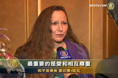 和平宣導者 雷切爾.哈瓦:“這場秀(神韻)真是神奇。我今天晚上獨自開了六十英裡來看神韻,我是兩天前才收到寄來的神韻特刊。我在加州半職工作,從加州回到家,一拿到神韻特刊,我就感受到一個訊息,我必須來看神韻。原本我並不清楚我為何要來看神韻,但是現在我很確定知道為甚麼,因為我心中真正了解到並且感受到這個信息是給全世界人類的。我想這是一個重要關鍵時刻,我一定將這個訊息告知我所有遍佈全球為世界祈福和為和平禱告的朋友。今晚我得到的訊息就是最重要的是愛和相互尊重,現在是時候了,這就是我在神韻中找到的。