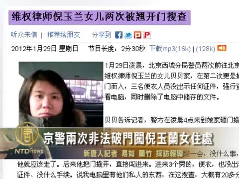 北京警方從29號凌晨4點多開始,持續騷擾維權律師倪玉蘭的女兒貝貝,便衣男警在沒有出示任何證件的情況下,2度破門闖入屋內。