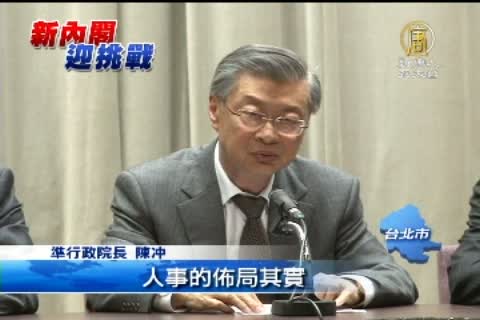 【新唐人亞太台2012年1月31日訊】頭條新聞,帶您看到今天的政治焦點,內閣人事在今天(31日)由準閣揆陳冲對外正式公佈。一半以上的部會首長繼續留任,而新面孔,包括之前投入嘉義立委選舉的陳以真,擔任青輔會主委。另外還 延攬了前GOOGLE亞太營運總監張善政,出任政務委員。對於新內閣人事佈局,陳冲說一切以「適才適所」作為內閣人事安排的考量。