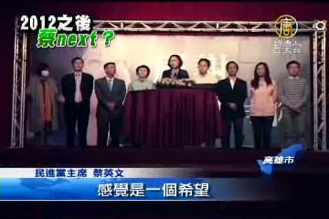 【新唐人亞太台2012年1月31日訊】民進黨主席蔡英文謝票之旅31號抵達高雄,蔡英文提出願景,期許民進黨的下一個世代領導人,是能夠獨當一面、捨我其誰的下一個世代,並期許陳菊扮演重要的關鍵角色。