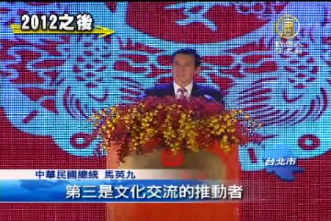 中華民國總統 馬英九:「我們中華民國在未來的四年,仍然跟過去一樣要在國際社會當中,扮演五項的角色,第一是和平的締造者,第二,是人道援助提供者,第三是文化交流的推動者,第四是新科技與商機的創造者,第五是中華文化的領航者。」