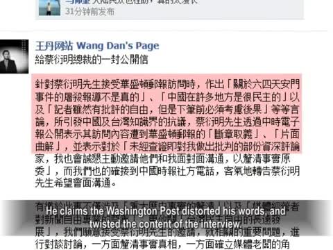 Tsai left a message on Wang Dan's Facebook page, clarifying