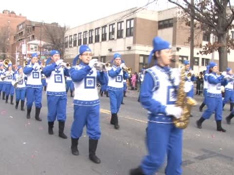 身穿藍白兩色清新亮麗傳統中式服裝、踏著整齊的步伐、吹奏著《法輪大法好》、《送寶》等樂曲,格外引人注目。在法拉盛緬街兩邊擠滿了觀眾,很多人對天國樂團隊伍鼓掌、招手。
