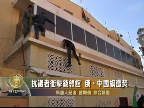 【新唐人2012年2月6日訊】星期天,抗議者在敘利亞駐土耳其伊斯坦布爾的領事館前發起示威並試圖衝擊領館,抗議者表示敘利亞阿薩德政權除了殘暴之外沒有其他。類似抗議在週六俄、中否決安理會制裁敘利亞決議後接連發生,貝魯特的抗議者還在俄領館前焚燒了俄羅斯和中共國旗。