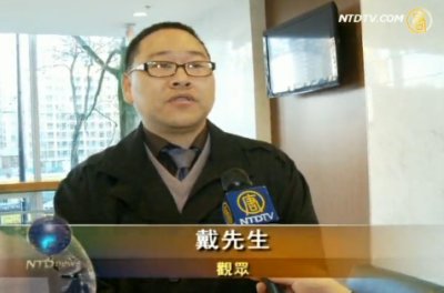 戴先生:“感到在這裡能欣賞到中國的傳統文化的一些藝術,這是我們在國內都沒有看到過的,而且她是用一種非常嶄新的表現形式,也是以前沒有看到過的。”“所以看了以後感覺非常激動,深深的被這個(神韻)所打動,這是一次很好的機會,讓我能夠發掘我們作為華人內心深處的那種東西能夠有一種共鳴。”