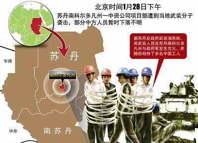 2007年11月,中共的維和工程兵大隊首度被派往戰爭頻繁的蘇丹達爾富爾地區協助當地建設。上個月28號,一工地47名中國工人中,29人被挾持至今。