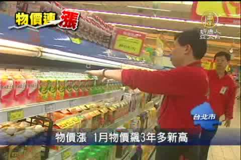 【新唐人亞太台2012年2月7日訊】好,謝謝吳教授的分析。新內閣面對的挑戰,除了剛剛吳教授分析的問題之外,還有就是不斷連番上漲的物價。主計處最新調查,1月份物價年增率為2.37%,創下3年又3個月來的新高,飲料市場也傳出漲價消息,市面上一款茶品飲料在年節前改包裝,並且印上新的價 格,但零售通路遲遲還沒調漲價格,廠商坦言,原料成本增加2成,所以才打算漲價,不過何時正式漲還沒確定,加上民眾也感受到近期油電價格也是蠢蠢欲動,恐怕也還會再衝擊物價。