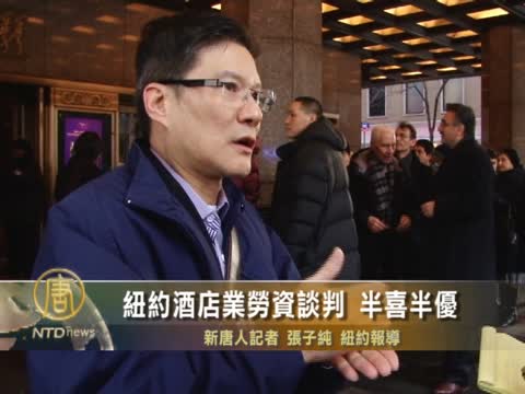 【新唐人2012年2月8日訊】擁有3萬名會員的紐約酒店餐館業工會與時代廣場希爾頓酒店等77家酒店,2月7日下午在紐約無線電城音樂廳達成新的勞資合約初步協議﹔目前仍有另外36間酒店未達成協議,和其餘75間酒店拒絕續簽合約。