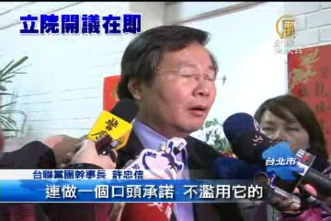 【新唐人亞太台2012年2月9日訊】新聞頭條首先來關心 ,立法院朝野今天再次針對第八屆第一會期的開議日進行協商。 由於民進黨團和台聯黨團要求國民黨團承諾,不會在程序委員會中阻擋法案,國民黨團沒有接受,因此宣告協商破局。院長王金平裁示,16日將再舉行協商,如果朝野仍未能取得共識,17日將舉行談話會決定開議日期。