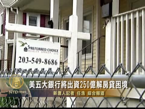 【新唐人2012年2月10日訊】在經過一年多的協商後,美國最大的五家銀行和多家聯邦機構等週四正式宣佈了房地產市場有史以來最大金額的和解協議。這五家最大的銀行同意提供250億美元,幫助受房貸困擾的消費者和州政府,超過100萬房主可望受益。