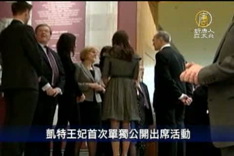 【新唐人亞太台2012年2月10日訊】英國威廉王子的妻子、劍橋公爵夫人凱特,星期三(8日),首次單獨出席了公開活動,目前正在駐防福克蘭群島為英國皇家空軍服役的威廉王子,要到月底才會回到倫敦,凱特王妃首次的單獨出席也特別引人注目。