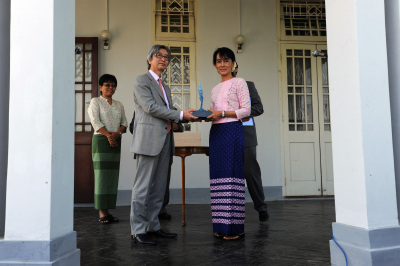 這是昂山素季第二次被授予聯合國教科文組織(UNESCO)的「促進容忍和非暴力獎」。她首次獲得該獎是在2002年第二次被當局軟禁獲釋後。