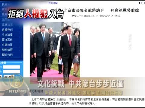 【新唐人2012年2月13日訊】北京市委副書記、北京市市長郭金龍此次來臺,不同於過去其他大陸省市團,多是以招商名目來臺,而是率領500人的大型文化參訪團,參加在台灣舉行的「北京文化周」。戰略專家表示,中共對臺戰略指導原則,已經開始從社會、經濟、文化各方面進行戰術的應用,未來這方面作為會更加強化。