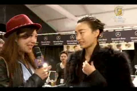 先開始的是享譽國際的華裔設計師王薇薇的秀,一走進後台,就被忙碌嘈雜的景象所圍繞,桌子上擺放著各種吸引人的美妝工具,化妝師和髮型師們也在緊張的為模特兒定妝,我們現場發現了來自中國的超模秦舒培,一大早就趕秀場的她,此刻的感受如何呢?