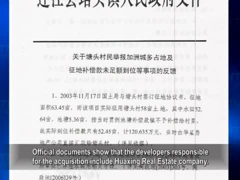 來自福建塘頭鄉的村民帶著厚厚的文件到本臺投訴家鄉200多畝農田被強徵,官方文件顯示,強徵土地的開發商包括紐約福建公所前任主席鄭明敏的華星房地產公司,以及股東之一為紐約珠城酒樓的雲南三鑫集團等。