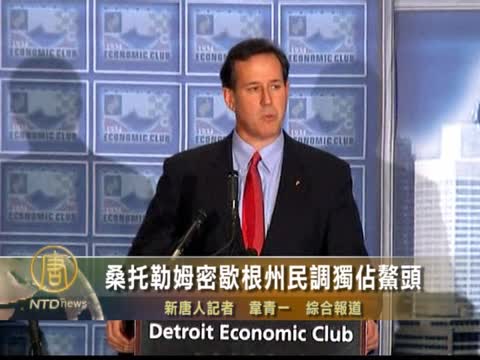 【新唐人2012年2月17日訊】美國密歇根州28日將舉行共和黨初選。週四一份最新民調顯示,本月接連拿下密蘇里、科羅拉多和明尼蘇達三州共和黨初選的桑託勒姆,在密歇根州以34%的支持率,反超此前一直領先的羅姆尼四個百分點,成為目前民望最高的共和黨參選人。