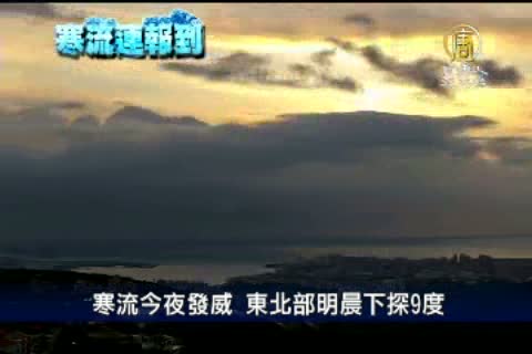 【新唐人亞太台2012年2月17日訊】強烈大陸冷氣團轉為寒流,冷空氣持續南下,中央氣象局觀測,今天清晨最低溫是在淡水,只有攝氏11.7度。那麼到了今天晚間7時15分,淡水低溫已經降到攝氏10.8度,氣象局表示,入夜後氣溫會更冷,明天清晨,嘉義以北最低溫將下探9度,提醒民眾一定要注意保暖。
