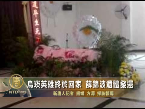 【新唐人2012年2月17日訊】廣東陸豐市烏坎村維權代表薛錦波,去年12月遭警方抓捕後,羈押期間離奇死亡,在村民及家人經過兩個多月不斷的討要,官方終於在16號返還遺體﹔家人當天為他搭設靈堂舉辦告別式,不過,官方限制參加者不得超過100人。