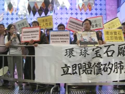來自廣東省海豐縣珠寶廠工人羅有國、鍾銀平連同多個支持團體,在會展中心入口處,高呼口號,抗議環球珠寶在內地的工廠,漠視工人生命安全,令兩名工人患上嚴重的矽肺病,但珠寶商拒絕執行法院裁決,令工人得不到合理賠償。抗議人士要求環球珠寶立即賠償損失。