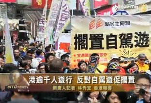 【新唐人2012年2月20日訊】逾千名市民星期日參加反對中港自駕遊大遊行,抗議二地政府黑箱作業簽訂秘密協議,容許大陸車自駕來港。他們擔心該計劃會影響香港的交通和環境,要求政府無限期擱置。