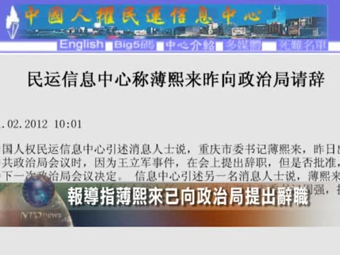 【新唐人2012年2月21日訊】人權民運信息中心表示,有消息指薄熙來已經在中共政治局會議上提出辭職。
