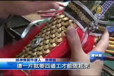 【新唐人亞太台2012年2月22日訊】聽過紙神像嗎?已有千年歷史的中國傳統技藝,比木胎泥塑神像還要起源更早的紙神像,現在重現雲林北港,工法精細,讓人眼睛為之一亮,現在不只國內,連國外都有訂單。馬上帶您來瞧瞧。