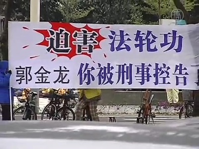 在郭抵達前幾小時,法輪功精神運動的學員們提出法律訴訟,控告郭金龍犯下違反人權罪。台灣法輪大法協會律師朱婉琪告訴媒體,郭在西藏任職時渉及鎮壓西藏人,以及在安徽省與北市迫害法輪功。