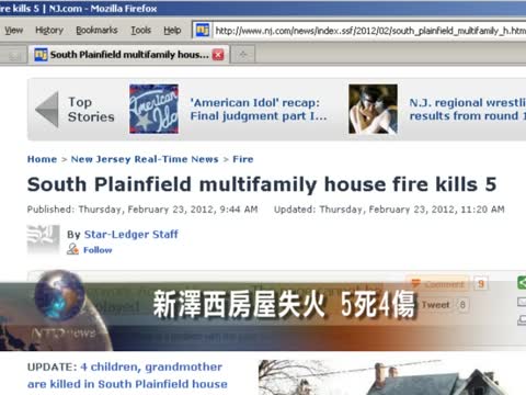 【新唐人2012年2月24日訊】星期四(2月23號),在紐約市西南方向大約30英里的新澤西小城南平地(South Plainfield)發生致命火災。