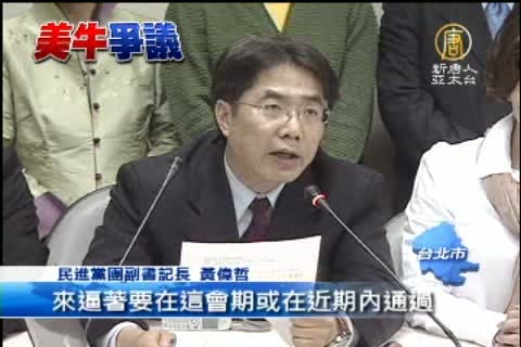 【新唐人亞太台2012年2月25日訊】立法院昨天開議,為了阻擋含瘦肉精的美牛進口,在野立委阻擋行政院長陳冲的施政報告,經過朝野協商,行政院承諾,「近期內」立法院沒完成修法前,不開放瘦肉精美牛,國民黨團說,「近期內」是指本會期,也就是五月底前不開放,朝野已經提出七個修法版本,要擋瘦肉精美牛。