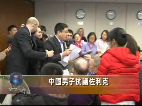 【新唐人2012年2月28日訊】世界銀行行長佐利克在北京召開記者會時,也發生了一個有意思的插曲,一名中國男子衝上去抗議,高喊中國國企不能私有話。
