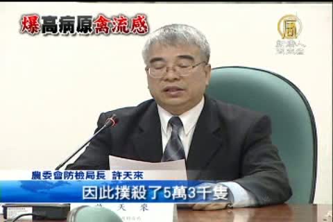 【新唐人亞太台2012年3月3日訊】新聞頭條,先帶您關心,農委會防檢局上午(3號)召開記者會表示,台南和彰化分別有養雞場,驗出禽流感病毒,兩地總共撲殺了將近6萬隻雞隻,雖然農委會強調禽流感對人體健康沒有影響,但是因為這是台灣第一次驗出H5N2的高病原性禽流感,雞隻和雞蛋出口受到不小影響,估計損失新台幣6到 7億元。