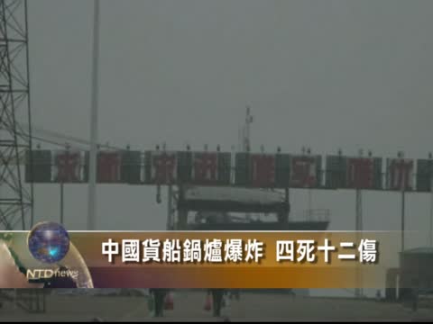 【新唐人2012年3月4日訊】中國南京發生一起貨輪鍋爐爆炸事故。爆炸發生在星期五晚上11點,南京長江油運公司紫金山船廠將這艘散貨船修理完畢,在交付給母公司中國長江航運(集團)總公司前,發生鍋爐爆炸,造成4名工人死亡,12人受傷送院治療,事故發生原因仍在調查中。