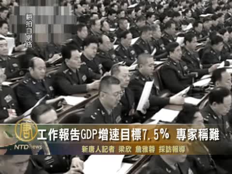 【新唐人2012年3月5日訊】中共第十一屆全國人民代表大會5號開幕,總理溫家寶在第五次會議,作政府工作報告中提到,要加快轉變經濟發展方式。今年國內生產總值(GDP)增速目標設定為7.5%。但專家認為,受不穩定因素等的影響,很難達標。