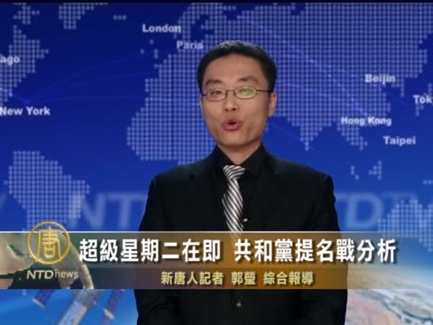 【新唐人2012年3月6日訊】共和黨總統提名戰進入白熱化,眾所矚目的超級星期二就要來臨,3月6號同時在10州一起舉行初選,把共和黨提名戰推向了高潮,到底目前戰況如何,請記者郭瑩為我們分析