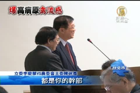 【新唐人亞太台2012年3月7日訊】針對農委會是否隱匿禽流感疫情,立委今天(7日)要求主委陳保基說明。不過,陳保基並沒有明確說明是否知情不報,只強調判定是否為高病原禽流感,需要專家認定。另外,揭發禽流感疫情的紀綠片導演李惠仁,也受邀出席今天在立法院的這場專案報告。