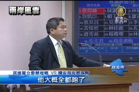 民進黨立委 蔡煌瑯:「2月22號,2月15號,他的晚上,媒體都沒有辦法掌握他到哪邊去,國安局掌握了嗎?」 「他跑了340幾個鄉鎮,那你國安局沒有掌握,他是對台統戰的,第二把交手,第二把人物,你國安局沒有掌握,那你國安局在做甚麼」