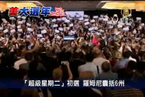 【新唐人亞太台2012年3月8日訊】帶您看到美國總統大選的初選情況,美國共和黨的「超級星期二」在10個州展開激烈競爭,其中競爭最激烈的俄亥俄州,羅姆尼最終險勝桑托榮,使已經擁有203票的羅姆尼成為超級星期二的大贏家,只有92張黨代表票的桑托榮這次可能很難逆轉。