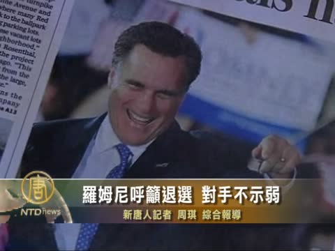 【新唐人2012年3月9日訊】共和黨黨代表票數遙遙領先的羅姆尼鼓勵對手趁早投降退出,不過桑託勒姆和金里奇都不買賬,表示要對抗到底。民主黨對手總統奧巴馬也不甘示弱,推出了競選預告片為連任助力。
