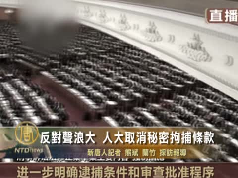 【新唐人2012年3月9日訊】在各方強烈的反對下,中共人大取消了刑訴法中,有關「強制失蹤合法化」的條例,並聲稱未來計劃在逮捕24小時內通知家屬。而在這之前,這個「失蹤條款」引發中國法律界的抗議聲潮。