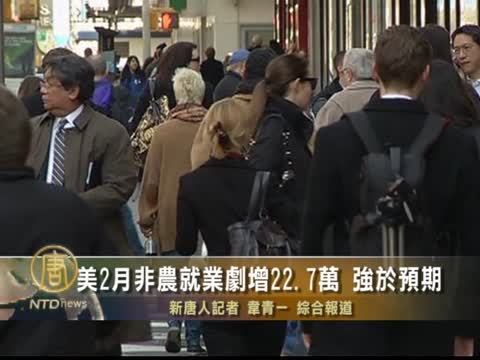【新唐人2012年3月10日訊】美國勞工部週五表示,2月份非農領域新僱佣了22.7萬人,超過了預期,連續三個月增長強勁,顯示出經濟復甦正在加強。不過2月失業率仍維持在一月份的8.3%。經濟分家認為,就業人數增長加快,增加了奧巴馬競選連任的機會。