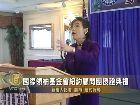【新唐人2012年3月10日訊】國際領袖基金會今天下午(3月9日)在法拉盛喜來登酒店舉行紐約顧問團授證典禮,美國眾議員趙美心專程抵達紐約為5位新任職的基金會顧問頒發證書,請看詳細報導。