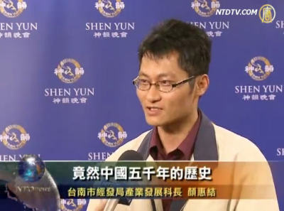 臺南市經發局產業發展科長顏惠結:「我感覺很震撼,竟然中國五千年的歷史可以用這樣的方式來呈現。等一下結束之後,我會打電話跟我的朋友來分享這一件事。」