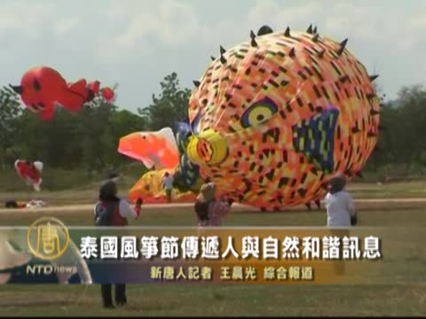 【新唐人2012年3月10日訊】3月10號(星期六)一年一度的泰國風箏節進入最後一天,超人、水母、企鵝……五彩繽紛的風箏飛滿了海濱城鎮碧武里的上空,傳遞人與自然和諧相處的訊息。