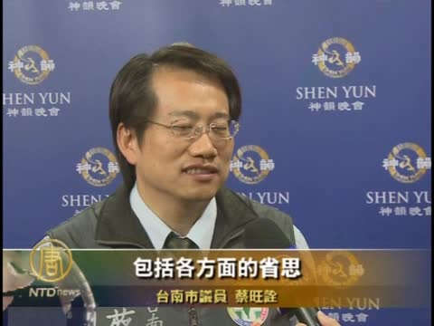【新唐人2012年3月13日訊】已經連續3年觀賞神韻演出的臺南市議員蔡旺詮, 3月11日,再度觀賞了美國神韻紐約藝術團,在臺南文化中心的最後一場演出,親臨神韻高超藝術形式的演出,蔡議員說,神韻觸動世人內心感動。